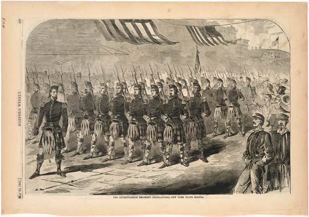 The 79th New York Volunteer Infantry was a military regiment organized on June 20, 1859 in the state of New York. Prior to the American Civil War it was one of the three regiments which formed the Fourth Brigade of the First Division of the New York State Militia. The Fourth Brigade included the 11th and the 69th regiments. The 79th gained fame during the American Civil War for its service in the Union Army. Created as a social club in New York city in the fall of 1858, the Highland Guard or 79th New York was created with the help of the St. Andrews and Caledonian societies of New York and wealthy financial backers like Samual M. Elliot and James Cameron, the brother of the secretary of war. The organization had no actual connection to the 79th Cameron Highlanders of Scotland. Only in name and in tartan (Cameron of Erracht; same as ours ) did they identify with the 79th of the British Army. Their original duty was to parade, train as heavy artillery, and also provided a guard for the Prince of Wales when he visited the United States and did the same for the Japanese ambassador. The 79th, without knowing it, set themselves up to take part in nearly every major engagement of the civil war and become one of the most known and traveled regiments in the Union Army. When the war broke out in 1861, the Highlanders were mobilized and, as the regiment was under strength, new men were quickly recruited before they left New York City. Under the command of Lt. Col. Samuel Mackenzie Elliott, the regiment was mustered into service for a three-year duration on 29 May 1861, and attached to Mansfield's command, Department of Washington. On 2 June 1861, the Cameron Highlanders, 895 men strong, complete with pipe band, marched down Broadway on its way to Washington. Passing through Baltimore, the Highlanders received a good welcome—in contrast with the reception the 6th Massachusetts Infantry had received a few days earlier. Arriving in Washington, the regiment served in the defenses of the capital until the middle of July when it was attached to Sherman's Brigade, Tyler's Division, in McDowell's Army of Northeastern Virginia, for the advance on Manassas. The regiment would eventually be engaged at, the First Battle of Bull Run, Pocotaligo, the Battle of Secessionville, Pope's Campaign in Northern Virginia, Chantilly, Maryland Campaign, the battles of South Mountain and Antietam, Battle of Fredericksburg, the ill-fated "Mud March", Vicksburg Campaign and the Siege of Vicksburg, Fort Sanders, and battles of the Wilderness, and Spotsylvania. It was at Spotsylvania that the original Cameron Highlanders were to fight their last engagement. As the regiment stood in line on the bloody battlefield, the men received the order for muster-out, their term of enlistment having expired on 13 May 1864. Those veterans whose term of enlistment had expired returned to New York City, where they were discharged. Less than 130 of the regiment's original members were left. Those with unexpired service were sent to guard Confederate prisoners bound for Alexandria. These men were later formed into companies A and B, which formed the nucleus of the "New Cameron Highlanders" that Col. Samuel M. Elliott had received authority to recruit on 4 May. In November 1864, companies C and D, made up of new volunteers, were added to the regiment, and Company E joined in January 1865. A further company, F, was organized in the field from recruits received in March 1865. The new regiment served at Cold Harbor, Bethesda Church, Petersburg, Weldon Railroad and Poplar Springs Church. In October, they were appointed provost guard of the 9th Corps, taking part in the Appomattox Campaign. After Robert E. Lee's surrender, the regiment moved back to Washington and took part in the Grand Review of the Armies on 23 May 1865. It continued duties at Washington until the men were eventually mustered out of Federal service on 14 June 1865, whereupon the regiment returned to state militia status. Ladies of the New York Scottish Society sent new glengarries for the regiment to wear for their re-entry into New York City. During the war, the 79th New York lost 198 killed, plus 304 wounded or missing, out of a total enrollment of 2,200.