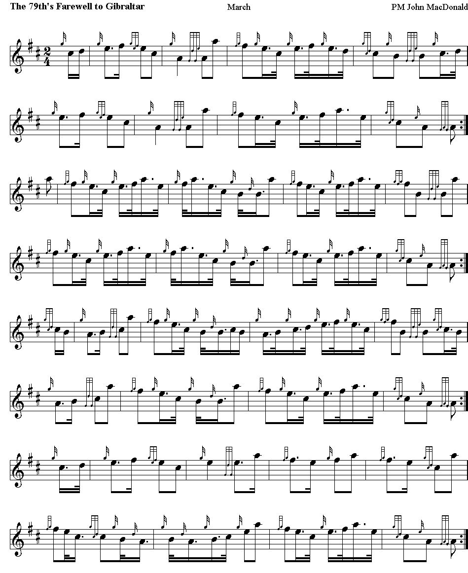 The 79th's Farewell to Gibraltar was written by Pipe Major John MacDonald of the 79th Regiment of Foot (Cameronian Volunteers). The regiment played a major part at Waterloo and also served in the Boer War, guarded the queen at Balmoral Castle, went to Ireland and eventually to WWI in France.