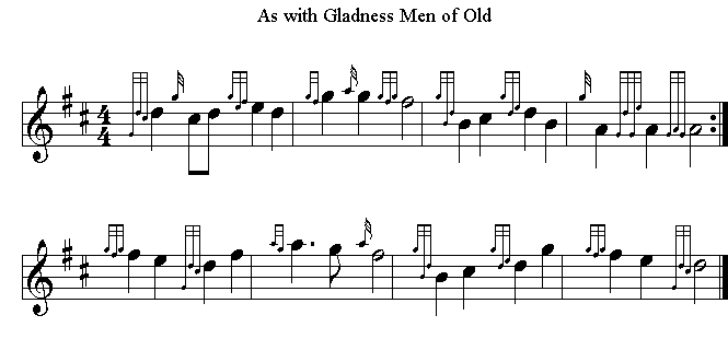 As with Gladness Men of Old "The tune “As with Gladness Men of Old” is by Conrad Kocher. Trained as a teacher, Conrad Kocher (b. Ditzingen, Wurttemberg, Germany, 1786; d. Stuttgart, Germany, 1872) moved to St. Petersburg, Russia, to work as a tutor at the age of seventeen. But his love for the music of Haydn and Mozart impelled him to a career in music. He moved back to Germany in 1811, settled in Stuttgart, and remained there for most of his life. The prestigious Cotta music firm published some of his early compositions and sent him to study music in Italy, where he came under the influence of Palestrina's music. In 1821 Kocher founded the School for Sacred Song in Stuttgart, which popularized four-part singing in the churches of that region. He was organist and choir director at the Striftsckirche in Stuttgart from 1827 to 1865. Kocher wrote a treatise on church music, Die Tonkunst in der Kirche (1823), collected a large number of chorales in Zions Harfe (1855), and composed an oratorio, two operas, and some sonatas. William H. Monk created the current form of William Dix by revising and shortening Conrad Kocher's chorale melody for “Treuer Heiland, wir sind hir,” found in Kocher's Stimmen aus den Reiche Gottes (1838). Most British hymn writers in the nineteenth century were clergymen, but William Chattrerton Dix (b. Bristol, England, 1837; d. Cheddar, Somerset, England, 1898) was a notable exception. Trained in the business world, he became the manager of a marine insurance company in Glasgow, Scotland. Dix published various volumes of his hymns, such as Hymns of Love and Joy (1861) and Altar Songs: Verses on the Holy Eucharist (1867). A number of his texts were first published in Hymns Ancient and Modern (1861).