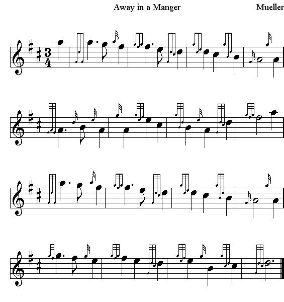 Away in a Manager (Mueller) "Away in a Manger" was first published in the late nineteenth century and used widely throughout the English-speaking world. In Britain, it is one of the most popular carols; a 1996 Gallup Poll ranked it joint second. Although it was long claimed to be the work of German religious reformer Martin Luther, the carol is now thought to be wholly American in origin. The two most-common musical settings are by William J. Kirkpatrick (1895) and James Ramsey Murray (1887). The most popular musical setting in the United States is commonly known as "Mueller". The melody was first published, under the title "Luther's Cradle Hymn", by James R. Murray in his collection Dainty Songs for Little Lads and Lasses (1887). James Ramsey Murray (1841 - 1905) was an American composer and author including of songbooks. His work includes hymns and Christmas music and was published by Root & Cadyas well as S. Brainard Sons. Murray included a claim that the hymn was "[c]omposed by Martin Luther for his children". As a result, Murray's melody appeared, without credit, in several subsequent publications. By 1914, the melody was attributed to "Carl Mueller" and this attribution was repeated several times in other publications. The identity of "Carl Mueller" is unknown, but the tune is widely known as "Mueller" as a result.