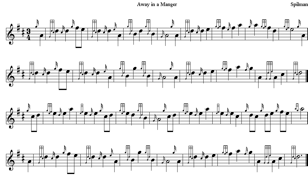 Away in a Manager (Spilman) "Away in a Manger" was first published in the late nineteenth century and used widely throughout the English-speaking world. In Britain, it is one of the most popular carols; a 1996 Gallup Poll ranked it joint second. Although it was long claimed to be the work of German religious reformer Martin Luther, the carol is now thought to be wholly American in origin. The two most-common musical settings are by William J. Kirkpatrick (1895) and James Ramsey Murray (1887). The most popular musical setting in the United States is commonly known as "Mueller". The melody was first published, under the title "Luther's Cradle Hymn", by James R. Murray in his collection Dainty Songs for Little Lads and Lasses (1887). James Ramsey Murray (1841 - 1905) was an American composer and author including of songbooks. His work includes hymns and Christmas music and was published by Root & Cadyas well as S. Brainard Sons. Another popular arrangement, found at least as early as 1897, sets the words to Jonathan E. Spilman's 1838 melody "Flow Gently, Sweet Afton". Jonathan Edwards Spilman (April 15, 1812 –May 23, 1896) was a Kentucky lawyer, minister, and composer. Spilman graduated from Illinois College in 1835. While at Transylvania Law School, 1837, he wrote the music for Robert Burns' "Flow gently, sweet Afton", best remembered of his seven melodies, and also "We Hail Thee Carolina", the alma mater of the University of South Carolina.