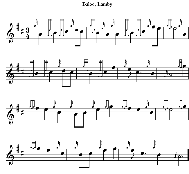 Baloo, Lamby “Baloo, Lamby” is a traditional Scottish carol; author unknown. The full original title was "An Sang of the birth of Christ," from James, John and Robert Wedderburn's Ane Compendium Buik of Godly and Spirituall Sangis (1567). The Scottish word baloo means lullaby, hush-a-bye, or sometimes rendered sleep. Lammy denotes young or little lamb, and bairn is the Scottish word for child. It was said to have been transcribed by Dante Gabriel Rossetti in the 1850s.