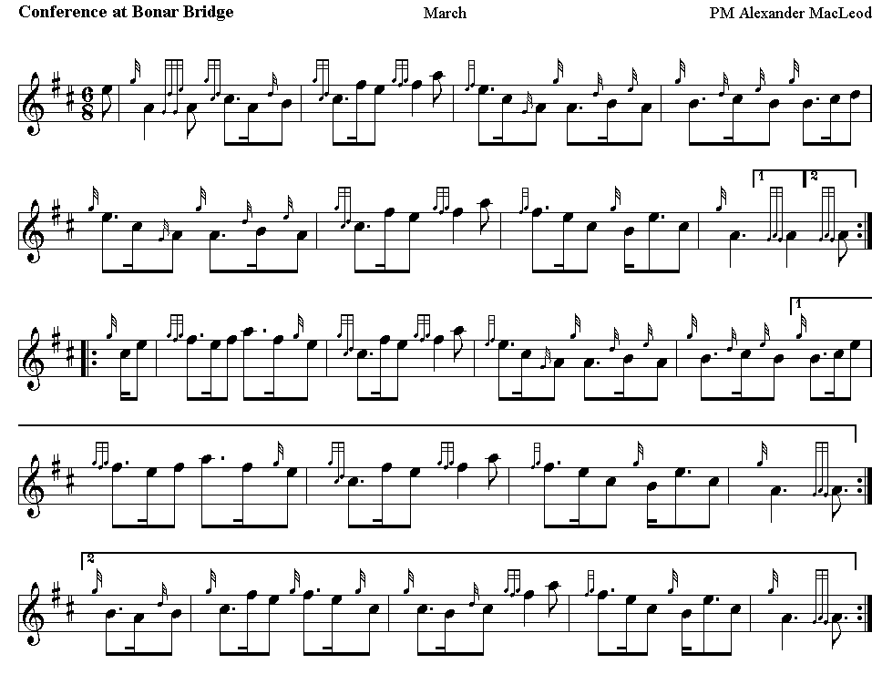 Conference at Bonar Bridge was composed by 26th Cameronian Regiment Pipe Major (for one day) Alexander MacLeod (1829-1903). MacLeod was a well-known composer, his best tunes being “The 26th Cameronians”; “The Drunken Piper”; “Weel Dune, my Hielan Lads”; “The Wee Sergeant’s March”; “March to Pretoria”; “Relief of Mafeking”; and the “Sinclair’s Welcome to Edinburth.” Bonar Bridge is a village on the north bank of the Kyle of Sutherland to the west and the Dornoch Firth to the east in the Parish of Creich in the Highland council area of Scotland. Construction of the first bridge (shown above) across the Kyle of Sutherland at Bonar Bridge started in September 1811 and completed in November 1812. The components of the bridge were cast in Denbighshire and assembled there, before being taken apart and transported to its site for re-erection. The replacement bridge of steel and granite was "built by The County Councils of Ross and Cromarty and Sutherland 1893 Opened 6th, July, 1893.” The third bridge built at Bonar is the currently standing bridge. It was built alongside the older bridge while it was still standing (but considered weak and needing renewal) and after it was opened to traffic on 14 December 1973 the second bridge was dismantled.