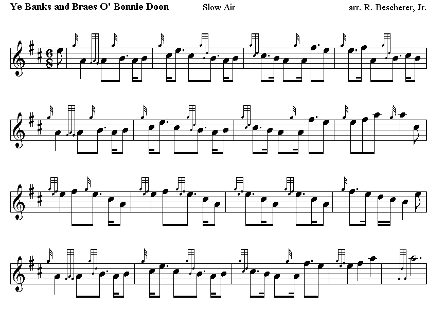 Burns wrote, Ye Banks and Braes O' Bonnie Doon around 1783. The Doon of the poem is the river Doon which flows from Loch Doon in Carrick, Fife to the Firth of Clyde. On the way, it passes by close to Burns' birthplace in Alloway, Ayrshire. Burns and his family left the house in Alloway in 1766 when he was seven, so it is doubtful that the poem is in any way an autobiographical one. Legend has it, according to the Complete Works of Robert Burns which was published in 1855, that the poem is about the beautiful Miss Kennedy from Dalgarrock who had her heart broken by a man named McDoual. Nevertheless, if you read it carefully you can feel the heartbreak and the longing for another. The poem is about the heartache and pain that love can cause, and is told from the perspective of a jilted or unrequited lover. The melody to this is purported to have been written in 1788 by a Charles Miller, who expressed a desire to compose "an authentic Scots air," and was advised by a friend, partly in jest to "keep to the black keys of the harpsichord and maintain some kind of rhythm." It first appeared in the Scots Musical Museum (1792 volume). A copy was given to Neil Gow, who printed it in Strathspey Reels (1788) as The Caledonian Hunts Delight - 4 years before it appeared with Burns' words in the Scots Musical Museum.