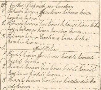An example of how grace notes were transcribed… Regarding grace notes, "h" the aspirate, qualifies all notes down to "low A", but often where "ha" obviously means "B" note, it must be concluded that it should be written "cha" (xa). Similarly "ho ho" should be "ho cho" (ho xo). The letter "d" is used, as is "t" to denote both "High G" and "D" grace notes, but an examination of the notation word, makes a mistake unlikely, thus "dieliu" means "F" with "high G" grace note, and then "high A" and "G". "Tihi" means two "E"s played with two "G" grace notes. "T" and "d" resemble each other very closely in Gaelic, but the context in canntaireachd makes it always easy to see whether "high G" grace note or "D" is meant. It is necessary to explain the compound grace note systems. "Dr" is doubling of "low G" by a touch of "D" grace note, and open "low A", and so on, over the whole scale. The letters "dr" are obviously a contraction of "dà uair", two times, or twice. "Trì" means doubling of "low G" by "D" grace note, and as "A" is opened, double "E" by "F" and "E" and open "E". This is a "Crunluath" form. "Tro" is the same, at first, but the doubling of "E" is done with the grips from "o" or the "C" note. This is "Crunluath-a-mach" (outer crunnluath). These examples will make the rest easy. In many tunes where the "tr" type appears, it obviously when translated should only have been a "dr" type, this confusion being only to the similarity of "d" and "t" in Gaelic.