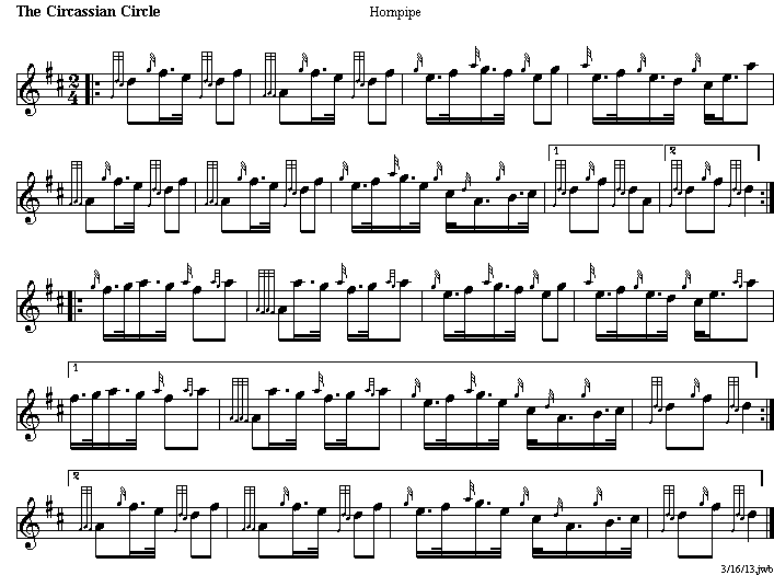 The Circassian Circle is a mixer type of collective folk dance. It is commonly found in folk balls in France, but also seems to be found around the world where it is danced in similar fashion. This dance stands out because France has a number of dances which are particular to the region from which they come. The Circassian Circle is one of the few mixer dances that everyone will know - and which is so easy anyone can figure it out with no explanation. Circassia is a mountainous region located in the Caucasus of Eurasia, in today's Russia. It consists of various ethnic groups and tribes that were at some points allied with each other with differentiations made between eastern and western Circassians. However, the dance seems to have originated in England (and not Circassia as one might have thought) during the 19th century, where what is now called "Circassian Circle" was only the second part of the original dance. In the Carmichael district of Lanarkshire, Scotland, around the turn of the 20th century it was always the first dance of the evening. The vehicle for the dance was usually the namesake melody followed by additional tunes at the same tempo, capped by a return to the original "Circassian Circle" melody. Canadians frequently have employed the tune "La Bastringue" to accompany it.