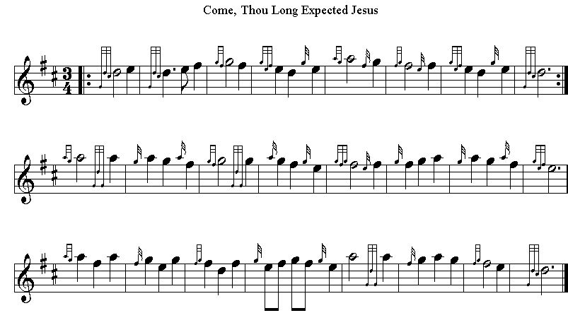 Come, Thou Long Expected Jesus "Come, Thou Long Expected Jesus" is a 1744 Advent and Christmas carol common in Protestant hymnals. The text was written by Charles Wesley. In 1744, Charles Wesley considered Haggai 2:7 and looked at the situation of orphans in the areas around him. He also looked at the class divide in Great Britain. Through this train of thought, he wrote "Come, Thou long expected Jesus" based upon Haggai 2:7 and a published prayer at the time which had the words: "Born Your people to deliver, born a child and yet a King, born to reign in us forever, now Your gracious kingdom bring. By Your own eternal Spirit, rule in all our hearts alone; by Your all sufficient merit, raise us to Your glorious throne. Amen." Wesley adapted this prayer into a hymn in 1744 and published it in his "Hymns for the Nativity of our Lord" hymnal. Wesley wrote "Come, Thou Long Expected Jesus" with the intent for people to remember Advent and Christmas as commemorating the Nativity of Jesus and preparing for the Second Coming. "Come, Thou Long Expected Jesus" was the first of a number of Wesley's hymns that became known as the "Festival hymns". These "Festival hymns" were published outside of Methodism by German, John Frederick Lampe in 1746. The hymn came into popular knowledge across Christian denominations in England via popular Baptist preacher, Charles Spurgeon. Spurgeon made a Christmas sermon in London in 1855 when he was 21 and included sections of "Come thou long expected Jesus" in it. He did this to illustrate his point that very few are "born king" and that Jesus was the only one who had been born king without being a prince. As a result of the hymn's growing popularity, including in the Church of England and American hymnals, the hymn was first published in the Methodist Wesleyan Hymn Book in 1875 after having previously been excluded. The reason the hymn had originally been excluded from the hymn book was that there had been no officially suitable music intended for it before then. In recent times, "Come, Thou Long Expected Jesus" has not been as well known as a Christmas Carol as others written around the same time. "Joy to the World" being one such example but "Come, Thou Long Expected Jesus" is still used to focus on the hope of the Second Coming of Jesus. The lyrics of "Come, Thou Long Expected Jesus" focus on God choosing to give a Messiah to the world in the form of Jesus. It also focusses on the Old Testament Israelites longing for the Messiah to come and take the burden of sins from them to take them upon himself. The last line of the first verse may have come from Wesley being inspired by 17th century philosopher; Blaise Pascal's claim that "There is a God shaped vacuum in the heart of every person that cannot be filled by any created thing, but only by God, the Creator." "Come, Thou Long Expected Jesus" has been set to a number of tunes. It is not known which tune Wesley originally intended for the hymn, hence why it was excluded from the "Weslyan Hymn Book", but it is likely that the first tune it was set to was "Stuttgart" by Christian Friedrich Witt which had been written in 1716.