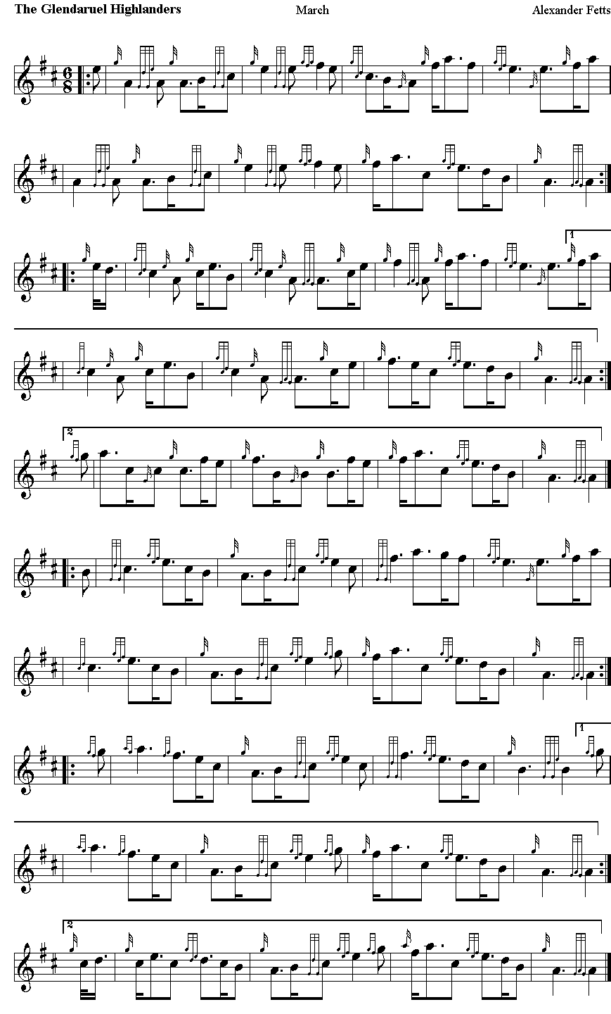 The Glendaruel Highlanders was composed about 1860 by Alexander Fettes, Pipe Major of the City of Aberdeen Volunteers. A native of Aboyne and a pupil of the elder Sandy Cameron (brother of Donald Cameron), Fettes was a friend of the great piobaireachd authority and pipe major John MacDougall Gillies, in whose honour he composed his most popular tune, "The Glendaruel Highlanders." He was a stone mason by trade and served as Pipe Major of the Aberdeen Highlanders from about 1865-1879. Afterwards he emigrated to South Africa and made a prominent life for himself there. He was Pipe Major of the Port Elizabeth Pipe Band and was several times mayor of Port Elizabeth. He had a great influence on piping in South Africa and died there in 1921.