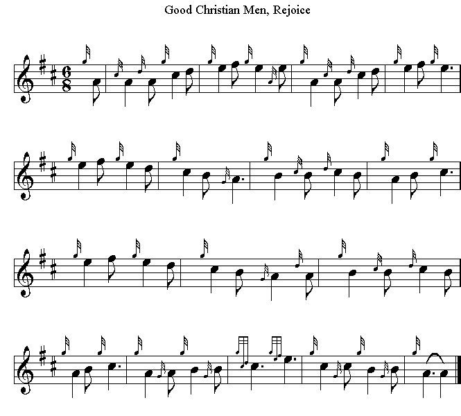 Good Christian Men, Rejoice "In dulci jubilo" (Latin for "In sweet rejoicing") is a macaronic text of German and Latin dating from the Middle Ages. The original song text is thought to have been written by the German mystic Heinrich Seuse circa 1328. The tune first appears in Codex 1305, a manuscript in Leipzig University Library dating from c. 1400, although it has been suggested that the melody may have existed in Europe prior to this date. In print, the tune was included in Geistliche Lieder, a 1533 Lutheran hymnal by Joseph Klug. It also appears in Michael Vehe's Gesangbuch of 1537. In 1545, another verse was added, possibly by Martin Luther. This was included in Valentin Babst's Geistliche Lieder, printed in Leipzig. The melody was also popular elsewhere in Europe, and appears in a Swedish/Latin version in the 1582 Finnish songbook Piae Cantiones, a collection of sacred and secular medieval songs. The tune appears in several collections by Michael Praetorius. There have been a number of translations of the Latin/German poem into English. The most popular that keeps the macaronic structure is R. L. de Pearsall's 1837 translation, which retains the Latin phrases and substitutes English for German. A looser translation produced in 1853 by John Mason Neale titles the work "Good Christian Men, Rejoice". John M. Neale's life is a study in contrasts: born into an evangelical home, he had sympathies toward Rome; in perpetual ill health, he was incredibly productive; of scholarly temperament, he devoted much time to improving social conditions in his area; often ignored or despised by his contemporaries, he is lauded today for his contributions to the church and hymnody. Neale's gifts came to expression early–he won the Seatonian prize for religious poetry eleven times while a student at Trinity College, Cambridge, England. He was ordained in the Church of England in 1842, but ill health and his strong support of the Oxford Movement kept him from ordinary parish ministry. So Neale spent the years between 1846 and 1866 as a warden of Sackville College in East Grinstead, a retirement home for poor men. There he served the men faithfully and expanded Sackville's ministry to indigent women and orphans. He also founded the Sisterhood of St. Margaret, which became one of the finest English training orders for nurses. Laboring in relative obscurity, Neale turned out a prodigious number of books and artic1es on liturgy and church history, including A History of the So-Called Jansenist Church of Holland (1858); an account of the Roman Catholic Church of Utrecht and its break from Rome in the 1700s; and his scholarly Essays on Liturgiology and Church History (1863). Neale contributed to church music by writing original hymns, including two volumes of Hymns for Children (1842, 1846), but especially by translating Greek and Latin hymns into English. These translations appeared in Medieval Hymns and Sequences (1851, 1863, 1867), The Hymnal Noted (1852, 1854), Hymns of the Eastern Church (1862), and Hymns Chiefly Medieval (1865). Because a number of Neale's translations were judged unsingable, editors usually amended his work, as evident already in the 1861 edition of Hymns Ancient and Modern; Neale claimed no rights to his texts and was pleased that his translations could contribute to hymnody as the "common property of Christendom."