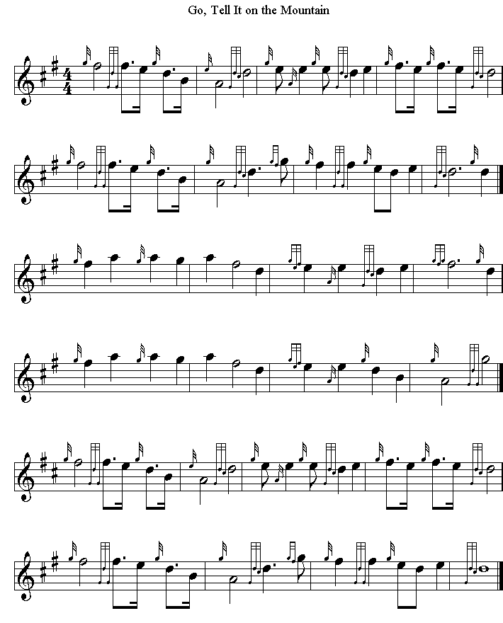 Go, Tell It on the Mountain "Go, Tell It on the Mountain" is an African-American spiritual song, compiled by John Wesley Work Jr., dating back to at least 1865. Work (b. Nashville, TN, 1872; d. Nashville, 1925), is well known for his pioneering studies of African American folk music and for his leadership in the performance of spirituals. He studied music at Fisk University in Nashville and classics at Harvard and then taught Latin, Greek, and history at Fisk from 1898 to 1923. Director of the Jubilee Singers at Fisk, Work also sang tenor in the Fisk Jubilee Quartet, which toured the country after 1909 and made commercial recordings. He was president of Roger Williams University in Nashville during the last two years of his life. Work and his brother Frederick Jerome Work (1879-1942) were devoted to collecting, arranging, and publishing African American slave songs and spirituals. They published two collections: New Jubilee Songs as Sung by the Fisk Jubilee Singers (1901) and Folk Songs of the American Negro (1907). It is considered a Christmas carol because its original lyrics celebrate the Nativity of Jesus.