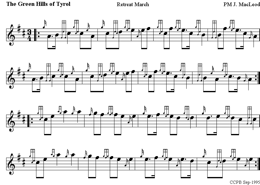 The Green Hills of Tyrol is one of the best known, and oldest, tunes played by pipe bands today. It was originally from the opera "William Tell" by Rossini, but was transcribed to the pipes in 1854 by Pipe Major John MacLeod after he heard it played by a Sardinian military band when serving in the Crimean War with his Regiment, the 93rd Sutherland Highlanders. Pipe Major MacLeod himself was well liked in his Regiment, and had a reputation for selflessness and amiability. In October of that year MacLeod and five other pipers participated in the event that made the Regiment’s reputation. The Russian heavy cavalry had taken the Causeway Heights, and its gun emplacements, above the supply port of Balaclava. Only the Sutherland Highlanders under Sir Colin Campbell stood between them and the port – the capture of which would have ended the campaign there and then. The heavy cavalry rolled down the hill onto the 93rd. Ordered to die where they stood if need be, the 93rd was formed into an extended line two ranks deep rather than in the defensive square formation more usually adopted by infantry facing a cavalry attack. The 93rd stood its ground, firing controlled volleys into the attacking cavalry. The cavalry faltered and veered to the left of the 93rd exposing their flank to more fire. The Russians were then beaten off by an audacious uphill charge by a smaller brigade of the British heavy cavalry. Some of the 93rd then made out to charge with the bayonet, but Sir Colin Campbell put paid to the notion, reputedly bellowing "93rd, damn all that eagerness". In any event Balaclava was saved and the Sutherland Highlanders secured their place in history. The repelling of a heavy cavalry charge by grossly outnumbered infantry was an unprecedented achievement. The feat was witnessed by The Times’ war correspondent who immortalized the 93rd as "the thin red streak tipped with a line of steel". Almost immediately the 93rd embedded itself in the Victorian popular consciousness as "the thin red line" and came to symbolize the perceived stoic bravery of all British soldiers. Unfortunately the debacle of the charge of the Light Brigade later that same day led to a stalemate at Balaclava and the war dragged on throughout the winter. When the Crimean campaign finally ended the 93rd were immediately dispatched to fight in the Indian Mutiny. In this campaign Pipe Major MacLeod distinguished himself at the siege of Lucknow when he was first through the breach and almost immediately began playing the pipes.