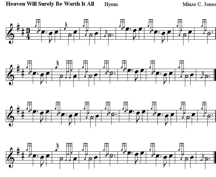 Heaven Will Surely Be Worth It All Wendell Oliver Cooper was born October 24, 1885 in Meriwether County, Georgia. He received his music education in schools of Oklahoma and Tennessee. He was known for singing in a quartet over the radio in Birmingham, AL. It is estimated he wrote some 1,500 hymns. Hhis hymn, “Heaven Shall Surely Be Worth It All”, is far and away the most popular among churches of Christ; however, his most published hymn was “Here Among the Shadows Living In A Lonely Land”. He was musical editor for Hartford Song Books. He worked on the faculty of the Hartford Music Institute. He was married to Cammella W. Cooper, but she passed away in 1929 at the age of 38. He lived in Cullman County, Alabama when he passed away in October 24, 1963, on his birthday, at the age of 78 years old. He is buried in Mount Hope Cemetery near the Mt. Hope Baptist Church in Crane Hill, Cullman County, Alabama. His tombstone reads “Death Is Only The Gateway To Glory”. The music was composed by Minzo C. Jones is scarce. One source states Jones was born July 27, 1888 and died June 1977. There is a reference to Jones being a resident in Bessemer, AL, but as of this writing there is no more information available to this researcher.