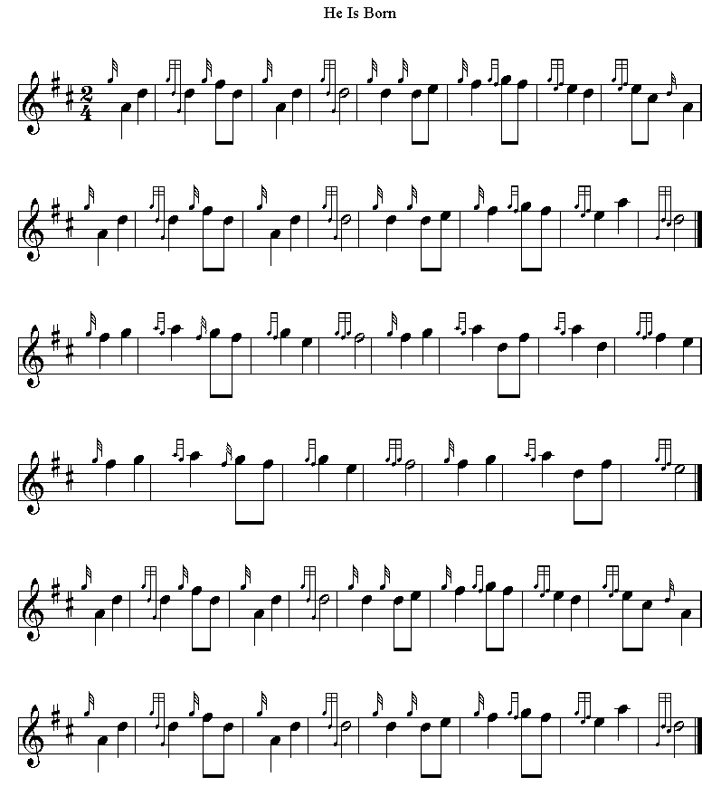 He Is Born "Il est né, le divin Enfant" (English: He is born, the divine Child) is a traditional French Christmas carol. The song was published for the first time in 1862 by R. Grosjean, organist of the Cathedral of Saint-Dié-des-Vosges, in a collection of carols entitled Airs des Noëls lorrains. The text of the carol was published for the first time in a collection of ancient carols, published in either 1875 or 1876 by Dom G. Legeay. The text of the carol details the birth of Jesus and the wait of 4000 years for this event, as foretold by the prophets. It both observes the humility of God's birth in a stable and calls on the Kings of the Orient to attend the child. The text of the carol has been translated into English numerous times. One translation (close in meaning and keeping to the original meter) is by Edward Bliss Reed (1930).