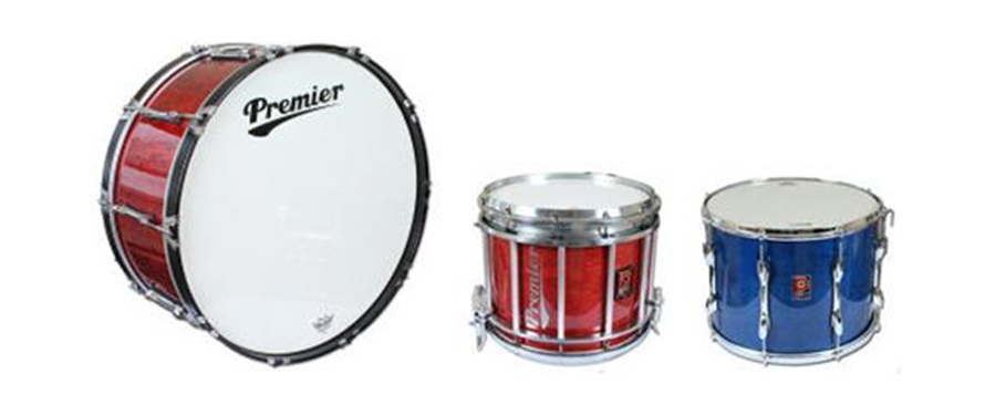 The side drummers play “pipe band snare drums.” These instruments are high tension marching snare drums, with Kevlar top heads, and with two snare strainer assemblies, one under the top head and one under the bottom head. High pitched, crisp sound…….and heavy. The side drums are played with lightweight sticks, for speed and a bright crisp tone.