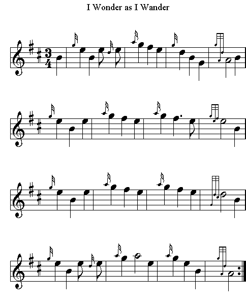 I Wonder as I Wander "I Wonder as I Wander" is a Christian folk hymn, typically performed as a Christmas carol, written by American folklorist and singer John Jacob Niles. The hymn has its origins in a song fragment collected by Niles on July 16, 1933. Niles (April 28, 1892 – March 1, 1980) was an American composer, singer, and collector of traditional ballads. Called the "Dean of American Balladeers", Niles was an important influence on the American folk music revival of the 1950s and 1960s, with Joan Baez, Burl Ives, Peter, Paul and Mary, and Bob Dylan, among others, recording his songs. While in the town of Murphy in Appalachian North Carolina, Niles attended a fundraising meeting held by evangelicals who had been ordered out of town by the police. In his unpublished autobiography, he wrote of hearing the song: A girl had stepped out to the edge of the little platform attached to the automobile. She began to sing. Her clothes were unbelievable dirty and ragged, and she, too, was unwashed. Her ash-blond hair hung down in long skeins. ... But, best of all, she was beautiful, and in her untutored way, she could sing. She smiled as she sang, smiled rather sadly, and sang only a single line of a song. The girl, named Annie Morgan, repeated the fragment seven times in exchange for a quarter per performance, and Niles left with "three lines of verse, a garbled fragment of melodic material—and a magnificent idea". Based on this fragment, Niles composed the version of "I Wonder as I Wander" that is known today, extending the melody to four lines and the lyrics to three stanzas. His composition was completed on October 4, 1933. Niles first performed the song on December 19, 1933, at the John C. Campbell Folk School in Brasstown, North Carolina. It was originally published in Songs of the Hill Folk in 1934. Niles's "folk composition" process caused confusion among singers and listeners, many of whom believed this song to be anonymous in origin. Niles undertook lawsuits to establish its authorship and demanded royalties of other performers of the song.
