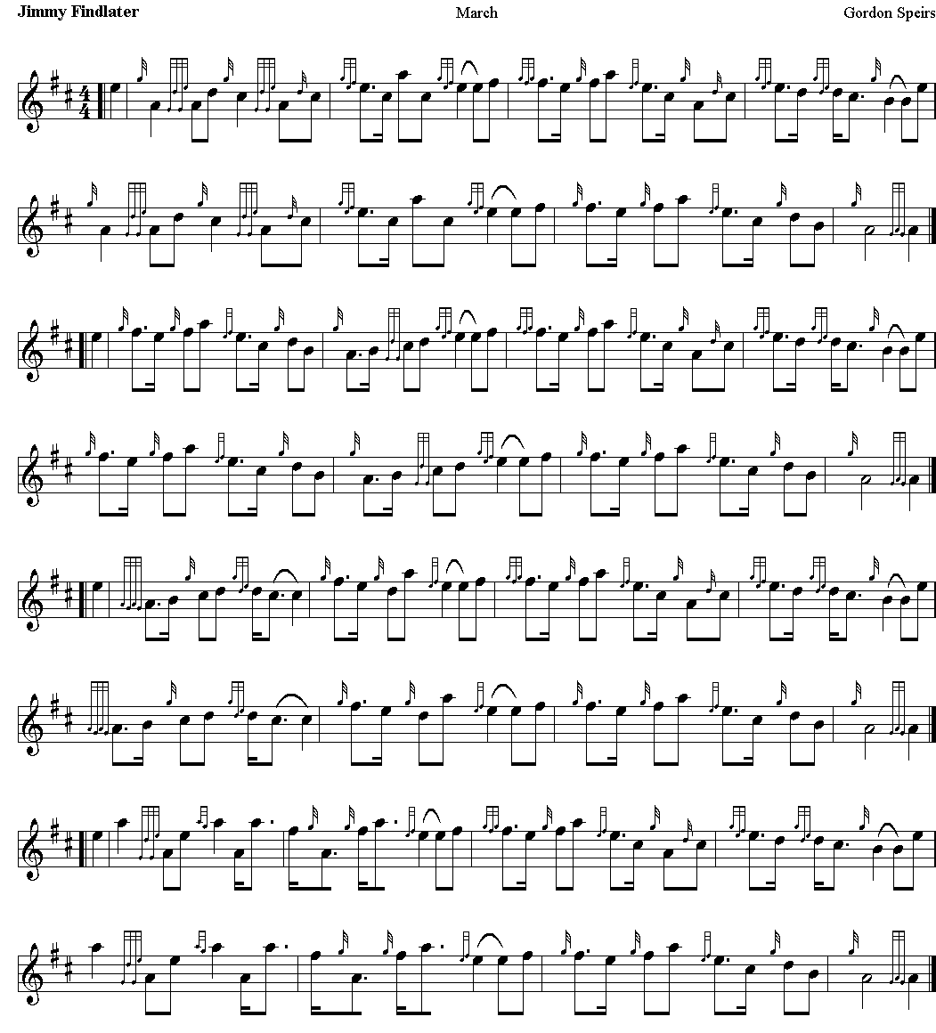 Jimmy Findlater, no relation to George Findlater V.C., was chairman of the London and South East Branch of the SPBA (later known as the RSPBA) during the 1970s. The tune entitled "Jimmy Findlater" was written on May 17, 1973 by Gordon Speirs at an airport while waiting to do a workshop for the Omaha Pipes and Drums. The "E D double-D C B" phrase that repeats in every part represents Jimmy's shuffling his feet while somewhat unsuccessfully trying to keep his balance down a hill, march in step, and carry the band's trophies all at the same time.