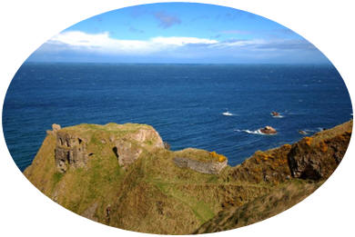 Findlater Castle (shown above) sits in a romantic position on a 50-foot-high cliff overlooking the Moray Firth on the coast of Banff and Buchan, Aberdeenshire, Scotland west of Banff, near the village of Sandend, between Cullen and Portsoy.
