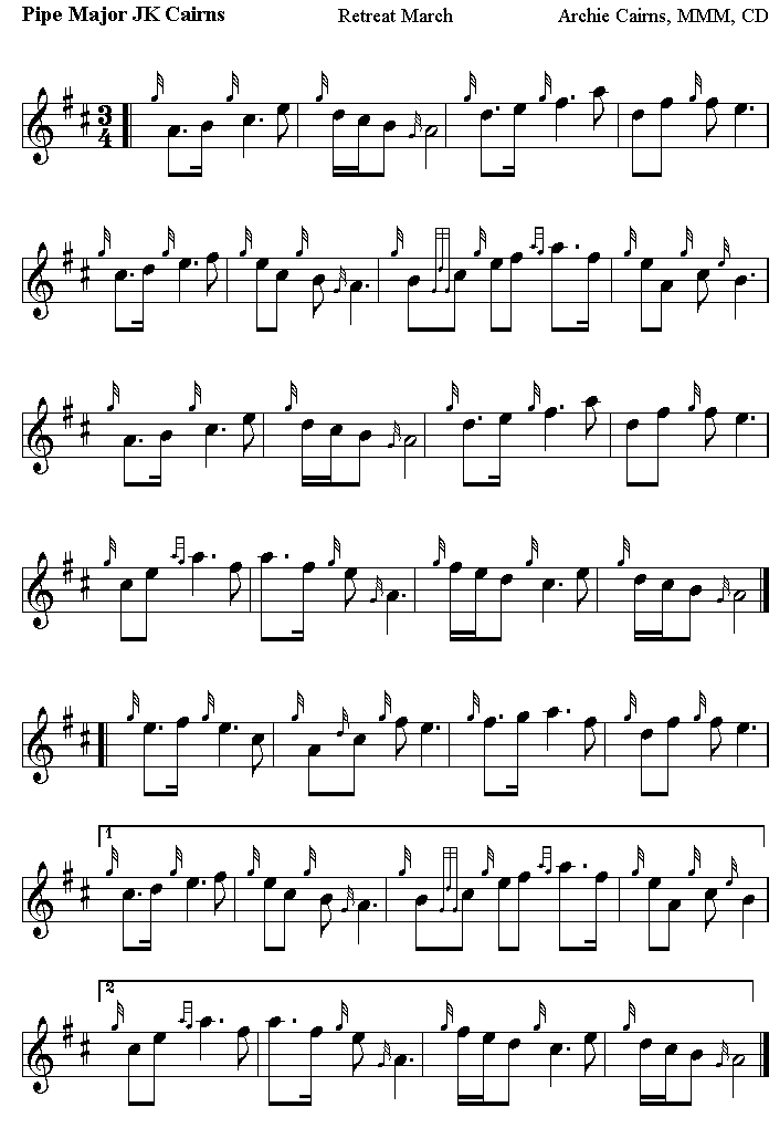 The retreat march Pipe Major J.K. Cairns was composed by Major Archie Cairns (left above), MMM, CD in Ottawa, Ontario, 1978, for his father (right above), who died in 1952, age 56. John Knox Cairns (1896 - 1952) was PM of the Argyll & Sutherland Highlanders of Canada 1945-1949.