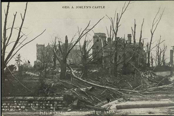 The 4 story, 35 room mansion includes a reception hall, music room, ballroom, a library and gold drawing room. The basement at one time had a bowling alley. The Castle and the carriage house were built of Kansas silverdale limestone. There is a wrought iron door on the Castle that weighs over a ton. Landscape architect Jens Jensen created an informal setting for the 5.5 acre site. Over 100 mature trees as well as a wide array of bushes and flowers were planted. They built a greenhouse to provide a constantly changing display of flowers for the giant flowerbeds on the estate. By 1899, the grounds were developed and the greenhouse completed. Sarah developed a nationally respected collection of orchids in the greenhouse. Jensen is also known to have done rock work and pools for the conservatory inside the house. On Easter Sunday morning, March 23, 1913, Mrs. Joslyn took her friends to the green house to view her orchid collection. That afternoon, one of the city’s worst tornados destroyed the greenhouse, much of the Castle grounds (shown below), and a wide swath of Omaha. While the orchids survived the tornado itself, a hard freeze followed on the heels of the tornado, destroying the collection.