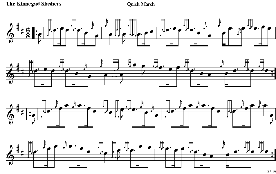 The Kinnegad Slashers (Buailteoiride Ceann-Na-N-Gad) is also known as "Drunken Mason," "Land of Sweet Erin," "Leitrim Slashers (The)," "Molly Maloney," "O! An Irishman's Heart," "O! Merry am I," "Old Brags (The)," "Paddy Digging for 'Goold'," "Powers of Whiskey," "Slashers," and "Twin Sisters." Kinnegad – meaning ‘the head of the ford of withes’ – is a town in County Westmeath, Ireland. The tune was first published in the third volume of O'Farrell's Pocket Companion (London, c. 1808). The first appearance in print in America was in John Paff's Gentleman's Amusement No. 2 (New York, c. 1812), as "Kinneygad Slashers." O'Neill, in Waifs and Strays of Gaelic Melody (1922), proposed this tune as the antecedent of "Turkey in the Straw." Gearóid Ó hAllmhuráin proposes that this tune was originally dedicated to the Kinnegad, Westmeath, hurling team (hurling being played with ash sticks in a decidedly rough-and-tumble encounter!). However, the title may actually honor an Irish yeomanry unit called the Kinnegad Cavalry, who, on July 11th, 1798, found themselves in defense of Clonard against the rebels. The attack of the United Irishmen was repulsed and the attackers dispersed, whereupon the cavalry of the Kinnegad Yeomen pursued them with much slaughter. Their success in this engagement earned them the sobriquet of Kinnegad Slashers. The Journal for Army Historical Research, Vol. IV, gives that "a lively melody, still popular in Ireland, was named The Kinnegad Slashers in complimentary commemoration of the achievements of that corps at Clonard." The tune has been the regimental slow march of the Gloucestershire Regiment, the 'Glosters', who inherited the nickname of the Old Brags from the 28th Regiment of Foot. Gloucestershire fiddler Stephen Baldwin (1873-1955), a veteran of the regiment, had this tune in his repertoire under the title "Old Brags (The)." Some see resemblances to the Scottish tune usually known as "Kenmure's On an' Awa Willie," (Kenmure's Up and Awa') after a Jacobite song of that name, but the relationship seems more distant than with other more closely related tunes. Others claim to see resemblance in the Scottish "Bannocks o' Barley Meal." A rondo on "The Kinnegad Slashers" was composed by Peter K. Moran and published in Dublin by W. Power, about the year 1817. The air was recorded in several music manuscript copybooks of 19th century musicians. It can be found under the title "Drunken Mason" in 'The Buttery Manuscript (c. 1784-1820, No. 951), a large copybook by John Buttery (1784-1854), who joined the 34th Regiment in Lincoln, Lincolnshire, England, in 1797 and served as a fifer until discharged in 1814. A version was entered into American musician M.E. Eames's music manuscript book (Philadelphia?, 1859, p. 73) as "Irish Air." The melody can also be found in the music manuscript collection of musician John Burk, dated 1821, in the key of 'C' under the title "Irishman in London (The)," with the note that it is a 'Song'. Eames's song air takes its name from a farce by English dramatist William Macready (1755-1829), called The Irishman in London; or, the Happy African (1793), although there was no music in the play. Yorkshire fiddler Lawrence Leadley's "Molly Maloney" is almost note for not the same tune as 'Kinnegad'. Multi-instrumentalist John Rook, of Waverton, Cumbria, entered the tune into his 1840 music manuscript collection as "Kinny Gad." Uilleann piper and Church of Ireland cleric James Goodman also inked a transcription of the tune into his mid-19th century music manuscript.