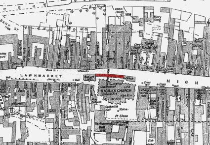 Built around 1460, the Luckenbooths or "Locked booths" housed Edinburgh's first permanent shops. The row of seven tenement buildings is connected to the Old Tolbooth, running parallel to St Giles. Originally exclusive to the use of goldsmiths and jewelers, they later housed tenants with a variety of trades including a baker, milliner, hairdresser and "ane chymist and druggist".