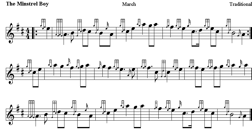 The Minstrel Boy is a song written by Thomas Moore (1779-1852) (shown above) who set it to the melody of The Moreen, an old Irish air. Moore was an Irish poet, singer, songwriter, and entertainer. It is widely believed that Moore composed the song in remembrance of a number of his friends, whom he met while studying at Trinity College in Dublin and who had participated in (and were killed during) the 1798 rebellion of the United Irishmen. However, the song gained widespread popularity and became a favorite of many Irishmen who fought during the United States Civil War. Moore was far more than a balladeer, however. He had major success as a society figure in London and in 1803 was appointed registrar to the Admiralty in Bermuda. From there, he traveled in Canada and the USA. Moore is considered Ireland's National Bard and is to it what Robert Burns is to Scotland. Moore is commemorated by a plaque on the house where he was born and by a large bronze statue near Trinity College Dublin.