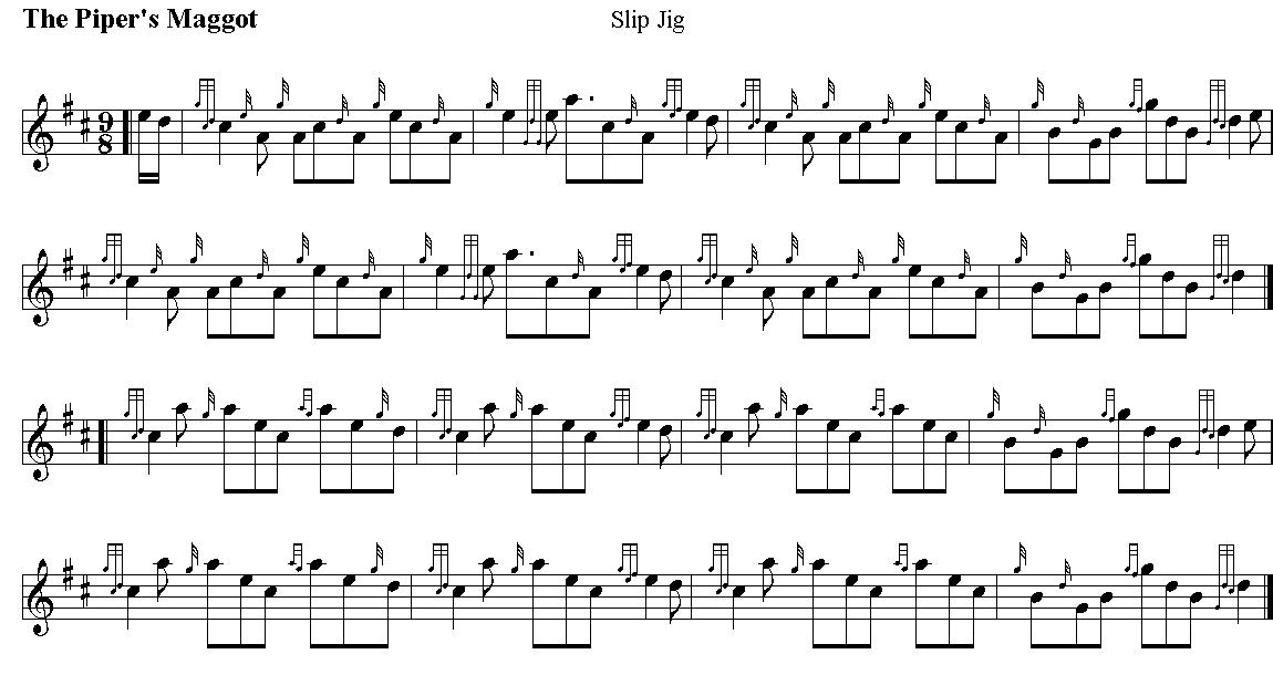 Slip jig refers to both a style within Irish music, and the Irish dance to music in slip-jig time. The slip jig is in 9/8 time, traditionally with accents on 5 of the 9 beats. The slip jig is one of the four most common Irish stepdances, the others being the reel, the jig and the hornpipe. It is danced in soft shoes. At one time only men danced it, then for several decades only women, and today slip jigs can be danced by any dancer, though at a competitive level they are almost exclusively danced by women. This dance is graceful and controlled, with heels very high, often called "the ballet of Irish dance". Because of its timing, the slip jig is longer than the reel for the same number of bars of music. In Irish stepdance competition, the tempo of 113 beats per minute is the same as other dances, but as each bar is longer, instead of dancing to 48 bars of music the dancer is only required to dance 40 bars of music (each of 2 1⁄2 steps). Stepdance judges prefer sliding motions with the feet and graceful movements that seem to slip across the floor. Also known as A Health To The Piper, Good Health To The Piper, Health To The Piper, Here’s A Good Health To The Piper, Here’s Good Health To The Piper, The Piper’s Whim, and Seo Slainte Do’n Piobaire, The Piper’s Maggot earliest appearance in print was in the Scottish Robert Bremner's 1757 collection. The tune also appears in the 1840 music manuscript collection of Waverton, Cumbria, musician John Rook A 'maggot' is a unit of liquid measure equal to a dram but also refers to a favourite, a thing of small or slight consequence or a whim or plaything; from the Italian maggioletta. In the context of maggot as a dram, the following anecdote illustrates the consequences of imbibing too many ‘piper’s maggots’. He became well known about the neighbourhood, and picked up a living from the passengers going that way, who generally threw him a few pence as the reward of his musical talent. A certain gentleman, who never failed in his generosity to the piper, was surprised, on passing one day as usual, to miss him from his accustomed place: on inquiry, he found that the poor man had been taken ill, in consequence of a very singular accident. On the joyful occasion of the arrival of one of his countrymen from the Highlands, the piper had made too free with the contents of his keg: these so over-powered his faculties that he stretched himself out upon the steps of the church, and fell fast asleep. Those were not times to sleep on church steps with impunity. He was found in that situation when the dead-cart went its round; and the carter, supposing of course, as the most likely thing in every way, that the man was dead, made no scruple to put his fork under the piper's belt, and, with some assistance, hoisted him into his vehicle, which was nearly full, with the charitable intention that our Scotch musician should share the usual brief ceremonies of interment. The piper's faithful dog protested against this seizure of his master, and attempted to prevent the unceremonious removal; but failing of success, he fairly jumped into the cart after him, to the no small annoyance of the men, whom he would not suffer to come near the body: he further took upon himself the office of chief mourner, by setting up the most lamentable howling as they passed along. The streets and roads by which they had to go being very rough, the jolting of the cart, added to the howling of thee dog, had soon the effect of awakening our drunken musician from his trance. It was dark, and the piper, when he first recovered himself, could form no idea either of his numerous companions or of his conductors. Instinctively, however, he felt about for his pipes, and playing up a merry Scotch tune, terrified, in no small measure, the carters, who fancied they had got a legion of ghosts in their conveyance. A little time, however, put all to rights; lights were got; and it turned out that the noisy corpse was the well-known living piper, who was joyfully released from his awful and perilous situation.