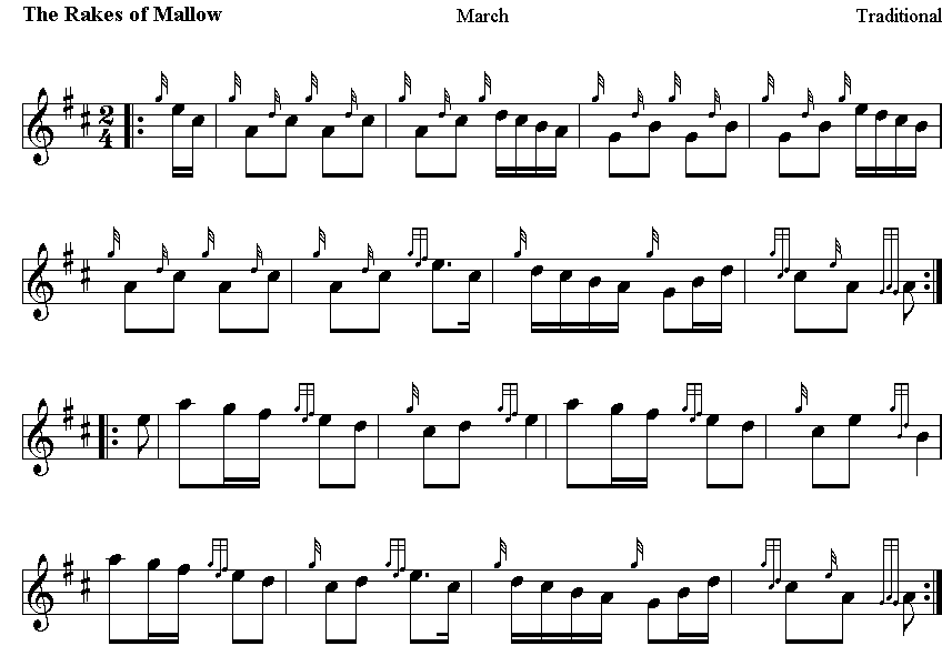 The word 'Rakes' in the title appears to be short for 'rakehell', which itself stems from the Old Icelandic word "reikall," meaning "wandering" or "unsettled." Popularly rakes referred to stylish and spirited young men. Mallow (Mala, Magh Ealla, and other variations in Irish) is the "Crossroads of Munster" and the administrative capital of north County Cork, in Ireland. The Northern Divisional Offices of Cork County Council are located in the town. Magh Ealla in Irish means 'Plain of the Swans'. The more recent Irish Mala or even Mála are government inspired re-Gaelicizations of "Mallow." Mallow developed as a defensive settlement protecting an important ford on the River Blackwater. Mallow developed rapidly in the late 16th century as a plantation town. It has prospered throughout the centuries as a market town due to its rich agricultural hinterland. The town was the HQ of the infamous North Cork Militia known as North Cork Rifles. The town's RIC barracks was the only one captured nationwide during the War of Independence. In retaliation, several main street premises were subsequently torched by the British Army (and not the Black and Tans as is sometimes reported). This is a well-known Irish drinking song. The tune was first printed circa 1740.