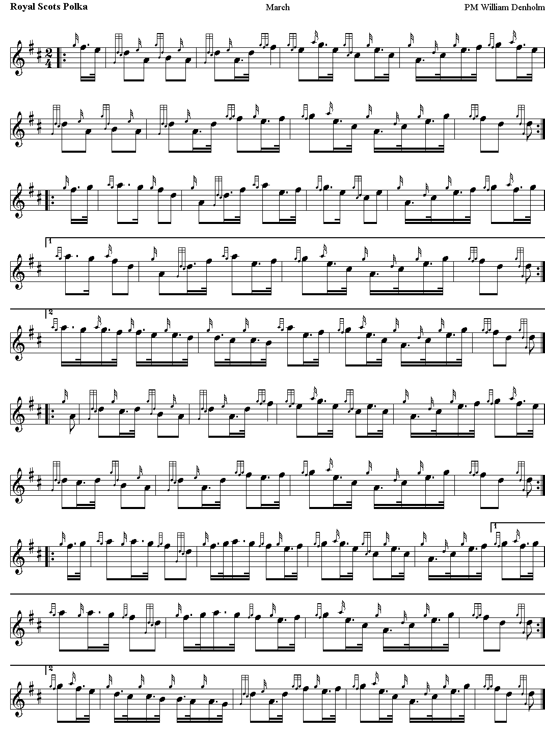 The Royal Scots regiment was first raised in 1633 as the Royal Regiment of Foot by Sir John Hepburn, under a royal warrant from Charles I, on the Scottish establishment for service in France. It was formed from a nucleus of Hepburn's previous regiment, formerly in Swedish service, which had been in existence since 1625. When in France it absorbed the remnants of a number of other Scottish mercenary units which had fought in Swedish service, and by 1635 had swelled to some 8,000 men. Sir John Hepburn, was killed at the siege of Saverne in 1636; it was then taken over by his nephew, Sir John Hepburn who was killed in action the following year. Lord James Douglas was appointed the new colonel, and the name of the corps was altered to the Régiment de Douglas, numbering some 1200 Scotsmen. The regiment fought with distinction, under Douglas, until he was killed in a skirmish near Douai in 1645, in attempt to take the city from the Habsburgs. His elder brother Archibald Douglas, Earl of Angus was appointed in his place. In all the regiment served in France from 1633 to 1661, when it was recalled to England. Because the regiment had been formed by Royal Warrant, it was legally part of the Crown's armed forces, even though it had been out of the country for three decades. As such, it was recalled to help secure the coronation of Charles II, and helped provide a model for the other regiments founded after the collapse of the New Model Army.The regiment returned to France from 1662-6 and 1667-78, seeing English service again during the Second Anglo-Dutch War; soldiers of the regiment responded to the Raid on the Medway, when Pepys recorded that Here in the streets, I did hear the Scotch march beat by the drums before the soldiers, which is very odde. 1678 marked the final end of French service, with the regiment placed permanently on the English establishment, and in 1680 the regiment was sent to the Tangier Garrison, where it won its first battle honor. In 1684, the regiment was titled His Majesty's Royal Regiment of Foot, and withdrawn to England. In 1685 they fought for James II in the Monmouth Rebellion, at the Battle of Sedgemoor, and the following year a second battalion was raised. In 1688, they were the only regiment of the army to remain loyal to James in the Glorious Revolution; both battalions of the regiment mutinied and were disarmed. During the War of the Grand Alliance, the regiment fought at the Battle of Walcourt (1689), the Battle of Steenkerque (1692), the Battle of Landen (1693) and the Siege of Namur (1695).They spent the late 1690s on garrison duty in Ireland The regiment served throughout the French and Napoleonic Wars, as well as the First and Second World Wars. Until 2004, the Royal Scots had been one of five line infantry regiments never to be amalgamated in its entire history, a claim shared by The Green Howards, The 22nd (Cheshire) Regiment, The Royal Welch Fusiliers and The King's Own Scottish Borderers. In 2004, as part of the Delivering Security in a Changing World defense review, it was announced that the Scottish Division would lose an infantry battalion. This was achieved through the amalgamation on March 23, 2006, of the Royal Scots with the King's Own Scottish Borderers, with the single battalion forming part of the new Royal Regiment of Scotland William Denholm enlisted in the 1st Battalion of the Royal Scots in the 1930s. He was promoted to Pipe Major of the battalion during the war. In 1942, a competition was held in Edinburgh for the composition of a 6/8 march to be named "The Battle of El Alamein," which Pipe Major Denhom won, although he had not taken part in the battle. It is in four measures, the first two of which were played in slow time at Pipe Major Denholm's funeral by his friend Captain John MacLellan of the Queen's Own Highlanders. The tune became popular for a time as a slow march in two parts, its prominence having been forgotten. It is now very rarely heard. After the Second World War he played in the Edinburgh Police Pipe Band under Pipe Major Donald Shaw Ramsay.
