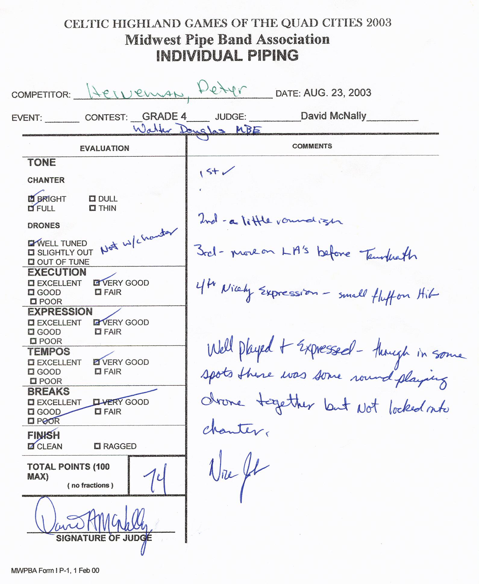 What the Score on Your Sheet Really MeansA judge, after listening to your performance, may assign it a point value and note it on your adjudication sheet as well as—hopefully, but not always possible—lots of constructive comments. (Depending on your association guidelines, points will be assigned either immediately after your performance or after all competitors have played.) Piping scores aren't like a math test where you get points for each question. You don't earn a set number of points for each properly played embellishment or for consistent tempo or for each correct melody note. You should consider the points you get for a performance for that event only. If you score 50 on one day, it could be an 85 from another judge for the same performance. The only truly meaningful comparison of your own performance scores over time would require the same judge, the same event, the same competitors playing the same tunes in the same playing order, under the same circumstances—impossible. It is the opinion of some judges that the primary purpose of a score sheet is to justify the result, not to be used as a lesson for improvement. Since in many instances there are more faults than can be covered on the form, especially given the time constraints, many judges just comment on the fundamental flaws first. This means that even if the mentioned flaws were corrected in advance, that piper still may not have won a prize for that event. The judge will listen to the sound quality of the instrument: both tuning and timbre.