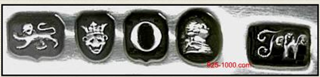 This set of marks indicates the piece was made of sterling, in the city of London, in 1789, during the reign of King George III, by Thomas Wallis. The British system of hallmarking is somewhat complex, but relatively easy to follow once the system is deciphered. British hallmarks include a fineness or purity mark, an assay office mark, a date letter, and usually but not always, a maker’s mark. A royal duty mark was added from 1784 to 1890 (not always found on jewelry of this period). The sequence of marks on a piece is arbitrary. Silver Standard Marks The Standard mark indicates the purity of silver.