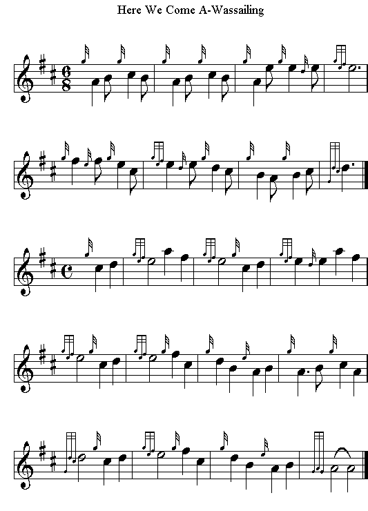 Here We Come A-Wassailing “Here We Come A-wassailing” (or Here We Come A-caroling) is a traditional English Christmas carol and New Year song, dating from at least the mid 19th century, but possibly much older. The old English wassail song refers to 'wassailing', or singing carols door to door wishing good health, while the a- is an archaic intensifying prefix; compare A-Hunting We Will Go and lyrics to The Twelve Days of Christmas (e.g., "Six geese a-laying"). Wassailing is a Medieval Christmastide English drinking ritual intended to ensure a good cider apple harvest the following year. The word wassail comes from Old English was hál, related to the Anglo-Saxon greeting wes þú hál , meaning "be you hale"—i.e., "be healthful" or "be healthy". Wassail is a hot, mulled punch often associated with Yuletide, drunk from a 'wassail bowl'. The earliest versions were warmed mead into which roasted crab apples were dropped and burst to create a drink called 'lambswool' drunk on Lammas day, still known in Shakespeare's time. Later, the drink evolved to become a mulled cider made with sugar, cinnamon, ginger and nutmeg, topped with slices of toast as sops and drunk from a large communal bowl. Modern recipes begin with a base of wine, fruit juice or mulled ale, sometimes with brandy or sherry added. Apples or oranges are often added to the mix, and some recipes also call for beaten eggs to be tempered into the drink. Great bowls turned from wood, pottery or tin often had many handles for shared drinking and highly decorated lids; antique examples can still be found in traditional pubs.