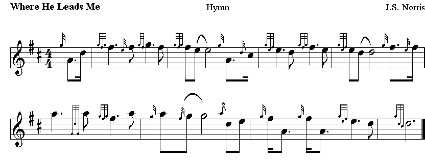 Where He Leads Me The text for “Where He Leads Me” was written by Ernest W. Blandy, a 19th-century author about whom no other information is available. His name is often misspelled Blandly. The tune was composed by John Samuel Norris, who was born on Dec. 4, 1844, at West Cowes on the Isle of Wight in the English Channel off the coast of England, the son of John and Harriet Chalk Norris. Moving to Canada, he was educated there and began to serve as a Methodist minister at Oshawa, Ontario, in 1868. For ten years he served Methodist churches in Ontario, Canada, and Wisconsin. In 1870, Norris was married to Elizabeth Ann Hurd in Sunderland, Ontario, Canada, and seven children were born to this home. Several years later, in 1878, he became a member of the Congregational Church and for five years served as a Congregationalist minister in the United States with churches in Wisconsin at Mondovi, Hixton, Grand Rapids, and Shullsburg. Then from 1882 to 1901, he served churches in Iowa at Ames, Webster City, Parkersburg, Peterson, and Tripoli. Norris published one collection of hymns, Songs of the Soul, but of the more than 100 hymns which he produced, only "Where He Leads Me" remains in common usage. It is not known exactly when it first appeared, but in many older collections it bears the copyright date of 1890. If this indicates the approximate date of its publication, it occurred during or immediately following the two years that Norris was with the Congregational Church in Webster City, IA. In 1901 Norris moved to Chicago, IL, where he remained until his death on Sept. 23, 1907.
